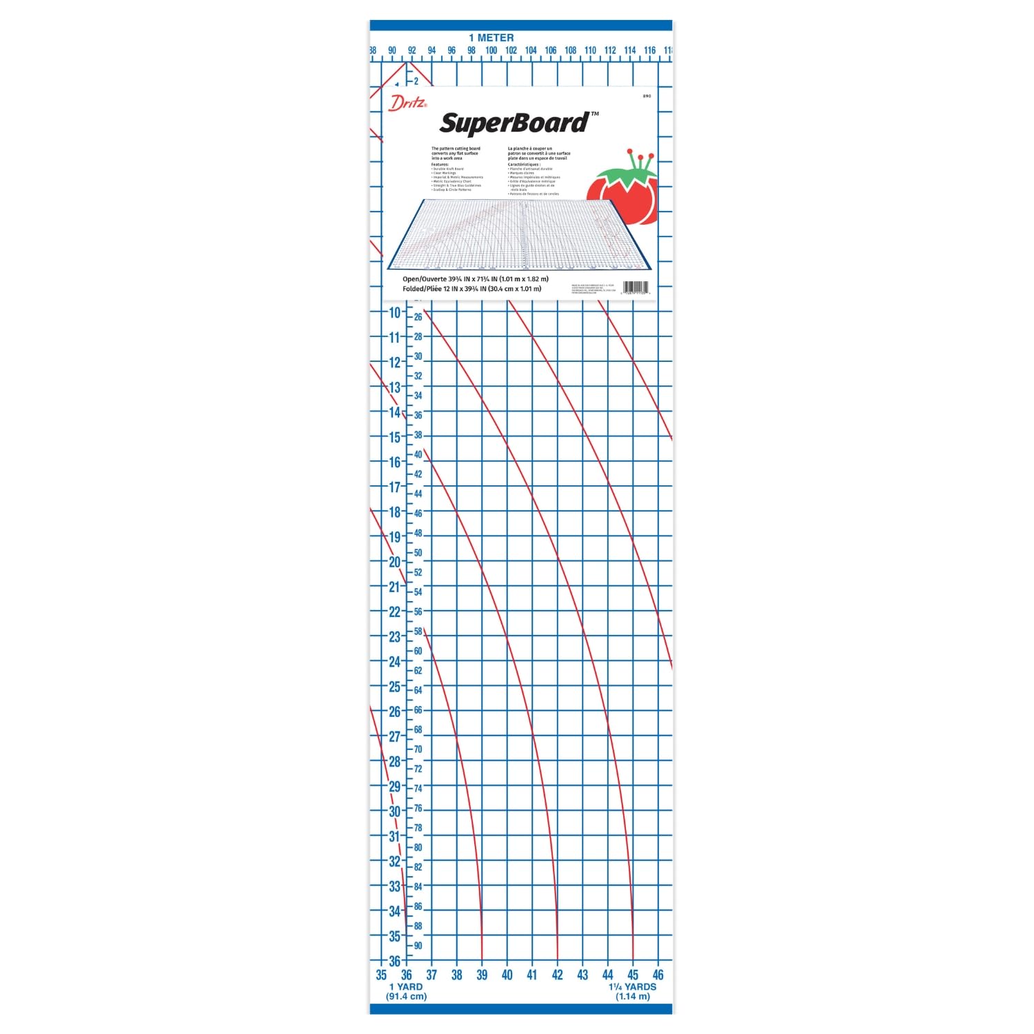 The Dritz890 Superboard is a versatile and durable kraft board measuring 39-3/4 x 72 inches, designed to convert any flat surface into a functional workspace. It features both inch and metric measurements, a metric equivalency chart, straight and true bias guidelines, and scallop and circle patterns, making it an essential tool for crafters and professionals alike.