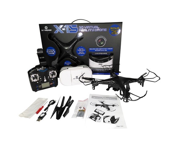 Description X-15 3D Virtual Reality Live Streaming Drone is one of a kind. The X15 can broadcast and capture live bird's-eye-view video footage directly to your smart device and can be viewed in 3D. With one-touch photo and video capture, you can capture amazing 360° views from up to 250' away. Easy to fly both outside and indoors. Works on both Android and Apple devices. Just download Free Skydrones APP and you are ready to go! With a Bonus of a Free Additional Battery take your fligh time to a new level- 15-20 minutes of flight time! Watch Videos in 3D using the Virtual Reality glasses that are included! Specifications: 2.4GHZ RC Live Streaming Video Drone 3D Video Recording capabailties 3D View from VR Glasses! 4.5-channel built-in gyroAuto Take Off and Landing One Key Return Removable rotor guardsMulti-dimensional flight capabilityDurable light weight bodySpeed control360 Spinning capbailitiesFour main rotors Recommended for ages 14+Transmitter runs on four AA batteries (not included)Camera requires microSD card to record (included)Product dimensions: 15.5" x 12.5" x 2.5"Fly Up to 400 Feet! 2 batteries Included Flying Time 8-10 Minutes PER BatteryIn the box: Drone, transmitter,VR Goggles 2 Lipo Batteries, four spare rotor blades, rotor guards,USB charging cable, Screwdriver and Instruction Booklet.Dimensions (Overall): 15 inches (L) x 12.5 inches (W) x 2.5 inches (H)Suggested Age: 14 Years and UpWeight: .45 poundsFeatures: Built-in camera, built-in LCD display, gyroscopic stabilization, rechargeableIndoor/Outdoor: Indoor, OutdoorAssembly Details: No assembly requiredBattery 2: 4 AA Alkaline, Required, not includedCPSC Choking Hazard Warnings: Choking_hazard_small_partsVehicle Motions: Flips, Forward, Hover, Land, Left, Reverse, Right, Spins, Up, fliesMaximum Running Time: 10 minutesMaximum Distance: 400 feetFeatures: Electronics: Built-in camera, LCD display, gyroscopic stabilization, rechargeableMaterial: PlasticBattery: 2 Lithium ion, Required, includedWarranty: 90 day limited warranty. To obtain a copy of the manufacturer's or supplier's warranty for this item prior to purchasing the item, please call Target Guest Services at 1-800-591-3869 Estimated shipping dimensions: 13.2INCH X 4.7INCH X 20.1INCH DPCI : 087-05-1604 UPC : 752229016149 TCIN : 51272420 Estimated shippimg weight: 3.05POUND