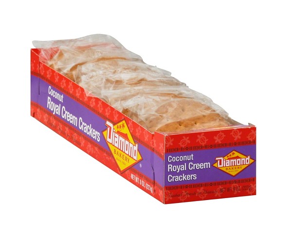 Description Add a unique treat to your snacking repertoire with Diamond Bakery Coconut Royal Creem Crackers - 8 oz. These Hawaiian-based biscuit-like crackers offer a slightly sweet, crunchy experience that goes well with coffee, tea or milk.Store: In a Dry location at Room temperatureCoconut flavored crackersSlightly sweet, creamy flavorPerfect with toppings or as a stand-alone snack Estimated shipping dimensions: 9.25INCH X 2.45INCH X 2.85INCH DPCI : 071-09-0068 UPC : 073218320079 TCIN : 47077987 Estimated shippimg weight: 0.5POUND