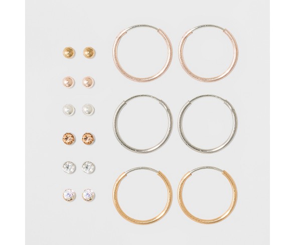 Description Variety earring set with studs and hoops. Includes studs in different finishes — gold, silver, rose gold — as well as rhinestone and faux-pearl studs. Three pairs of circular hoop earrings come in gold, silver and rose gold finishes.Number of Pieces: 9Item 3: Material: Zinc alloyItem 2: Material: Zinc alloy, AcrylicItem 1: Material: Acrylic, Steel, Nickel-free MetalItem 3: Width: .5 inchesItem 2: Width: .3 inchesItem 2: Weight: .03 ouncesItem 1: Weight: .03 ouncesItem 1: Width: .1 inchesItem 3: Length: .5 inchesItem 2: Length: .3 inchesItem 1: Length: .1 inchesCare & Cleaning: Spot or wipe cleanHoop and stud earring set with 9 earring pairs in a variety of stylesIncludes 3 pairs of huggie hoops in different finishesPost closure on the studs for comfortable wear Estimated shipping dimensions: 3.4646INCH X 0.315INCH X 5.1181INCH DPCI : 215-01-2942 UPC : 492150129425 TCIN : 53514140 Estimated shippimg weight: 0.0441POUND