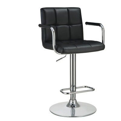 Description Coaster® Adjustable barstool in black color features durable vinyl leather back and seat for long-lasting comfort and appeal. Coaster® Adjustable barstool in black color features thick metal pedestal, base and footrest for convenience. Contemporary stool measuring 37 1/2" - 43 1/2" x 19" x 20 3/4" has chrome-colored arms and is perfect for home decor. Black leather like vinyl upholstery Chrome colored metal fixed arms and have coordinating arm covers for comfort Dimensions: 37 1/2" - 43 1/2"(H) x 19"(W) x 20 3/4"(L) Chrome colored metal pedestal base with footrest Seat size: 25" - 31"(H) x 16"(D) Style: Contemporary Featuring an adjustable height lever for individualized comfort Excellent addition to your home Warrenty: 1 year limited ⚠ WARNING: This product can expose you to chemicals including cadmium, which is known to the State of California to cause cancer or birth defects or other reproductive harm. For more information, go to www.P65Warnings.ca.gov/furniture. Specifications Upholstery : Vinyl Warranty Information : 1 Year Furnishing Color : Black Furnishing Style : Contemporary True Color : Black Height in Inches : 43.5 Width in Inches : 19 Depth in Inches : 20.75 Arm Design : Adjustable Assembly Information : Assembly required Bar Stool Features : Pedestal Base Pieces in Set : 1 Adjustable Height Maximum (Inches) : 43.5 Adjustable Height Minimum (Inches) : 37.5 Adjustable Seat Height Maximum (Inches) : 31 Seat Depth (Inches) : 20.75 Seat Height in Inches : 31 Adjustable Seat Height Minimum (Inches) : 25 Bar Stool Back Type : Solid Back Brand : Coaster Customizable : No Weight : 26.40 lbs. per Each