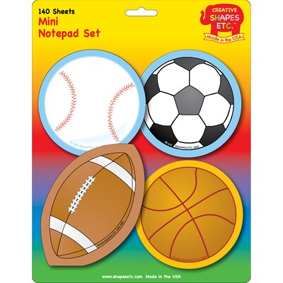 Description Creative Shapes™ "Sports" Mini notepad set is acid free and has four designs including football, baseball, basketball and soccer ball. Creative Shapes™ "Sports" Mini notepad set is ideal for children in the age group of 2 - 13 yrs. Set measures 3" x 3" and contains 140 cards per page. Theme: Sports Size: 3" x 3" (mini) Number of cards/pages: 140 Subject: Health Age group and grade: Ages 2 - 13 years and grades infant - 12th Acid free Four design includes football, baseball, basketball, and soccer ball Specifications Number Of Sheets : 101 to 150 Color Family : Multicolor Sheet Dimension : Other True Color : Multicolor Notepad Type : Notepad Brand : Creative Shapes Customizable : No Weight : 0.04 lbs. per Each