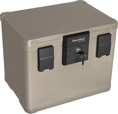 Description SureSeal by FireKing Fire and Waterproof Chests protect your irreplaceable and priceless items and important documents, keeping them dry, cool and safe from the fire. Fire & Waterproof Chest Steel construction with key lock Safe capacity .60 Cu.Ft. Interior Dimensions: 10.1"H x 12.2"W x 8.4"D Exterior Dimensions: 13"H x 16"W x 12.5"D SureSeal Chest protects your important business records, documents, digital media and other valuables from fire and flood ⚠ WARNING: This product can expose you to chemicals including Silica, which is known to the State of California to cause cancer, and Cadminium which is known to the State of California to cause birth defects or other reproductive harm. For more information go to www.P65Warnings.ca.gov Have you ever thought about what would happen if your home or business were in a flood or fire? Fire- and water-crisis situations bring lasting changes. How can you rebuild your life without your bank account numbers, birth and marriage certificates, titles, deeds and other critical documents? These important documents and valuables need to be protected from the very real risk of water, fire and smoke damage.This is where fire and waterproof chests come into play. A fire and waterproof box gives you a safe, secure place to stash your most valuable items away from the risk of both potential disasters. FireKing's waterproof and fireproof chest options keep everything from your birth certificate and passport to your valuables safe and protected. Whether you are safeguarding business records or personal items, you will find the security you need from FireKing. Specifications Warranty : 7-year mfg. limited warranty Weight (lbs.) : 51 Safe Type : Fire/Waterproof True Color : Taupe Material of Item : Steel Height in Inches : 12.5 Width in Inches : 16 Series or Collection : SureSeal Safe Locking Mechanism : Key Depth in Inches : 13 Safe Capacity or Volume : Less than 1.0 Cubic Ft. Capacity (cubic feet) : 0.60 Interior Dimensions : 10.1 x 12.2 x 8.4 Brand : FireKing Customizable : No Weight : 51.10 lbs. per Each