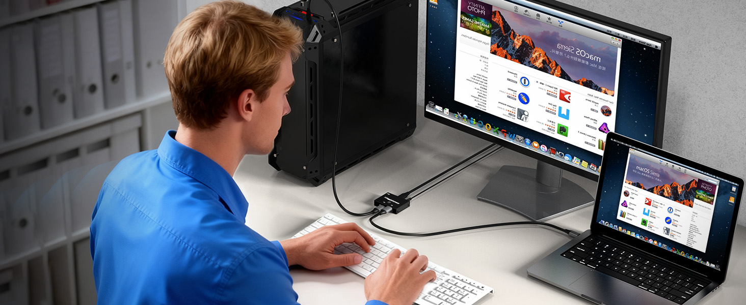 Excellent switcher. Works well on my Dell 34 inch curved monitor. I can easily switch between my work laptop and my home pc without having to swap plugs. Just get this 2 way switcher and a bluetooth mouse and keyboard and you can easily use 2 computers with 1 monitor