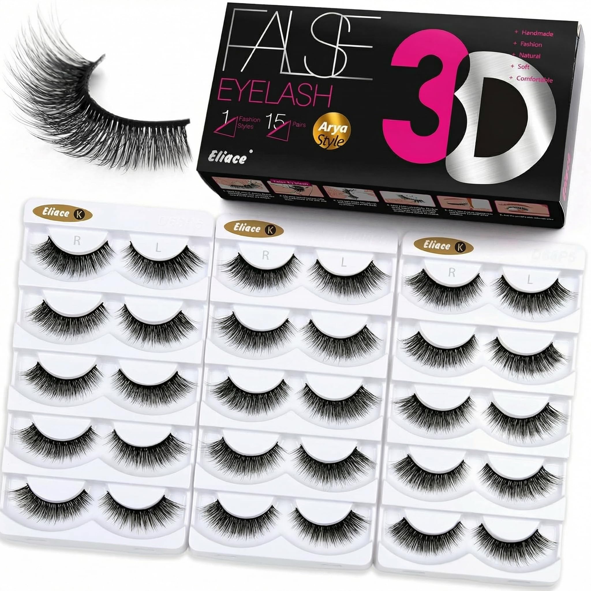 Eliace’s Arya Style 3D Faux Mink False Eyelashes deliver a natural yet dramatic cat-eye look with 15 pairs per pack. Crafted from cruelty-free materials, these lightweight lashes feature a soft, thin band for all-day comfort and are reusable up to 25 times. Perfect for beginners and pros alike, they come in a stylish gift-ready package that makes every application a statement.