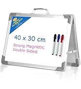The white board is approximately the size of an A4 piece of paper. Just right for individual use. It comes with 4 pens each with an eraser on the end for little changes and a larger rubber for bigger changes / erasing the board completely. The 4 colours are clear and vibrant . Squares on one side plane on the other. The strength of the magnet is just right and very useful for keeping the pens together when finished with. The large rubber means it is quick and easy to clean the board. Although this should be done straight away. Leaving writing or shapes for couple of days makes it harder to clean as you would expect. A great product ideal for use with children