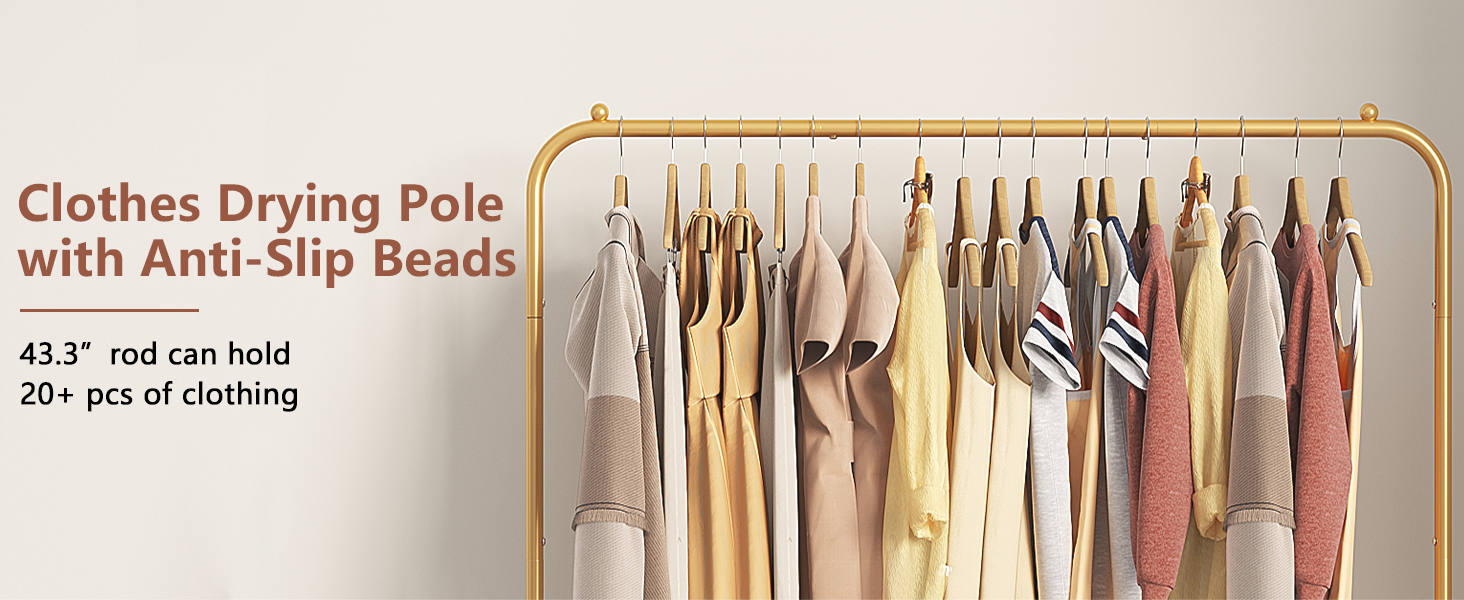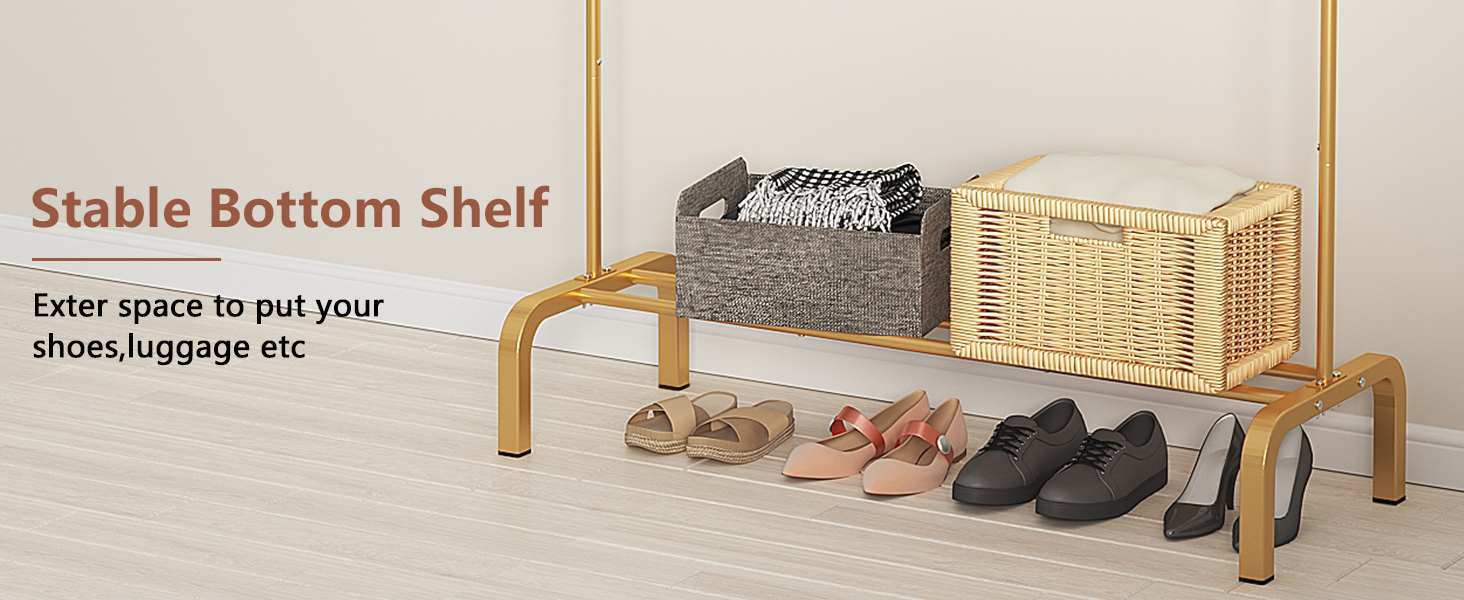 The JIUYOTREE 43.3-inch garment rack features a sturdy steel frame with an eco-friendly rust-resistant coating, a spacious bottom shelf for shoes or storage, and a 50-pound load capacity. Its sleek gold matte finish and non-slip top beads combine style with practicality, making it ideal for home or commercial use. Easy to assemble and portable, it’s the perfect upgrade for millennial professionals seeking chic, functional closet solutions.