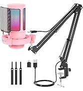 This USB condenser microphone features a 14mm premium sound chipset with 192kHz/24Bit sampling for ultra-clear audio, enhanced by noise cancellation. It offers a touch mute button with RGB lighting to indicate status, a gain knob for volume control, and a 3.5mm headphone jack for latency-free monitoring. Designed for gaming, streaming, podcasting, and professional recording, it includes noise reduction accessories like a pop filter and shock mount, and supports plug-and-play setup across PC, Mac, PS4/PS5, and phones.