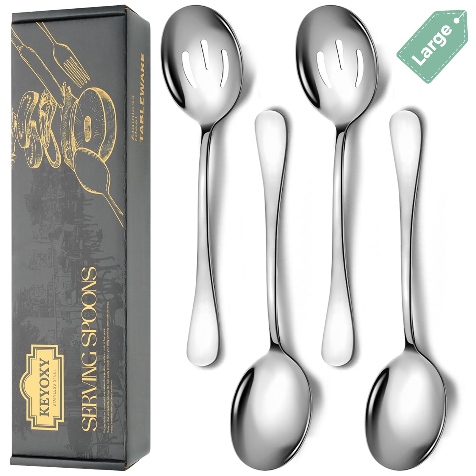 This 4-piece stainless steel serving spoon set includes two large serving spoons and two slotted spoons, each measuring 10 inches. Made from durable food-grade stainless steel with a sleek mirror finish, these utensils are dishwasher safe and perfect for any gathering, ensuring both functionality and elegance.