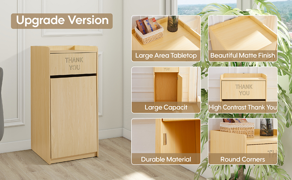 This 40-gallon commercial trash can cabinet combines robust wood construction with a sleek design, perfect for restaurants, cafeterias, and offices. Featuring a convenient tray holder, pet-proof door, and a welcoming ‘Thank You’ message, it streamlines waste management while enhancing any professional environment.