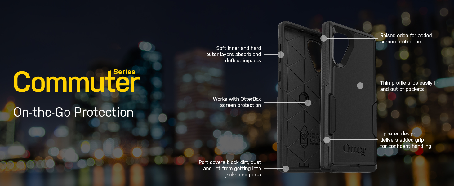 The OtterBox Commuter Series Case for Samsung Galaxy Note10 offers a slim, dual-layer design combining a soft inner layer and hard outer shell to protect against daily drops and bumps. It provides full access to ports and speakers, slips easily into pockets, and includes a limited lifetime warranty for lasting reliability.
