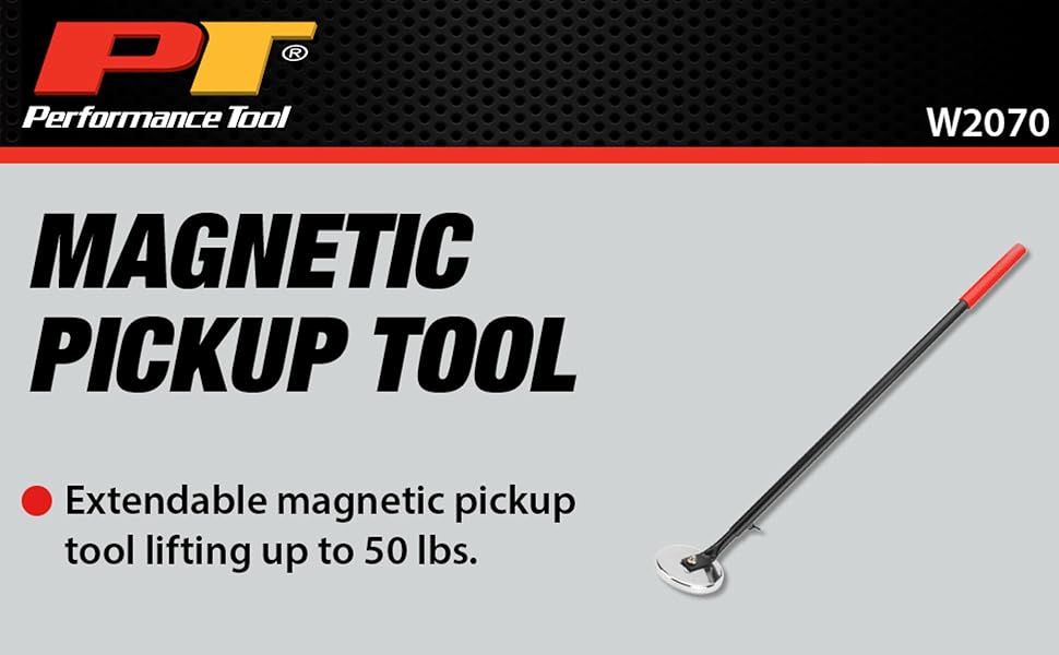 The Performance Tool W2070 is a hand-powered, extendable magnetic pickup tool featuring a strong 50-pound lifting capacity, a comfortable rubber handle, and a 3-inch magnetic head. Its telescoping design extends from 24 to 38 inches, making it ideal for retrieving ferrous metal objects in tight or hard-to-reach spaces.