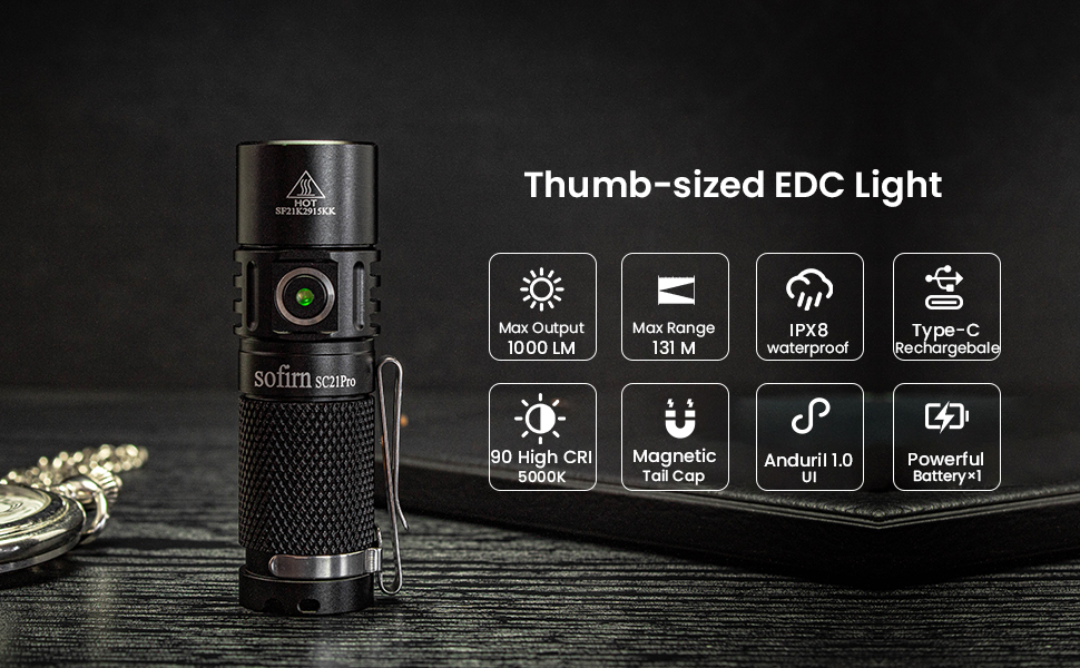 The SC21 Pro is a compact, rechargeable LED flashlight delivering up to 1100 lumens with a beam reach of 131 meters. Featuring a USB-C charging port, advanced Anduril 2.0 user interface, and a durable aviation-grade aluminum body, it’s designed for all-weather use. Its magnetic tail cap and pocket clip offer versatile hands-free options, making it an essential everyday carry tool for professionals and outdoor enthusiasts alike.