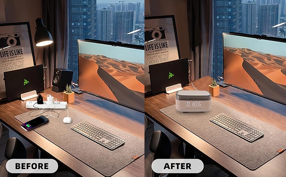 This multifunctional bedside alarm clock combines a Qi wireless charging station, Bluetooth 5.0 speaker with 33ft range, and dual alarms with customizable snooze and 3-level dimmable LED display. Designed with a fabric-wrapped speaker and touch controls, it’s a sleek, space-saving addition perfect for bedrooms, offices, or living rooms.