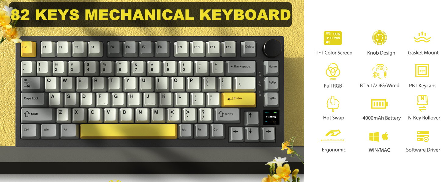 The AJAZZ AK820PRO is a compact 75% wireless mechanical keyboard featuring 81 durable PBT keycaps, triple connectivity modes (USB-C, 2.4GHz, Bluetooth 5.0), and a vibrant TFT color display with CNC metal knob for intuitive control. Designed for professionals and gamers alike, it offers a premium typing experience with noise reduction, full hot-swappable keys, RGB backlighting, and a robust 4000mAh battery for extended wireless use.