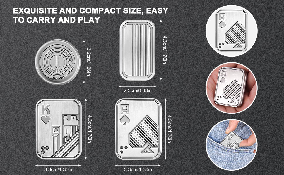 This set of 4 metal poker fidget sliders combines magnetic technology with sleek design to deliver a tactile, stress-relieving experience. Each slider features unique patterns and a smooth sliding mechanism that produces satisfying magnet sounds, ideal for adults and teens seeking stylish, portable decompression tools.