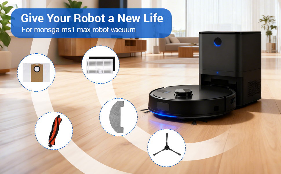 This Vacuum Replacement Parts Kit for MONSGA MS1 MAX includes durable main and side brushes, a high-efficiency filter, a gentle mop cloth, and a large-capacity sealed dust bag. Designed for easy, tool-free installation, these components ensure your robot vacuum maintains peak cleaning performance, capturing dust and debris effectively while providing up to 60 days of dust capacity per bag.